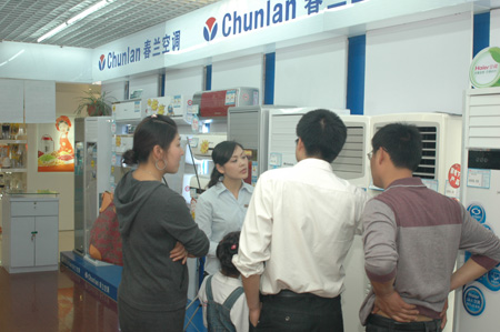 圖為5月1日,消費(fèi)者在蘇寧電器泰州連鎖店選購春蘭新品空調(diào)。