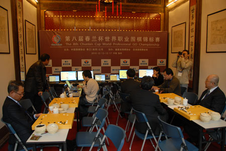 中國棋院領(lǐng)導和專業(yè)媒體記者研棋室研究棋局