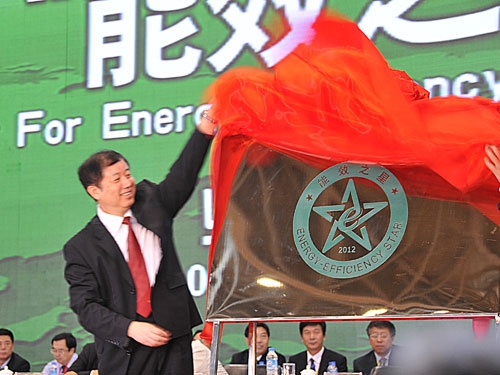 圖為國家工業(yè)和信息化部副部長劉利華為“能效之星”標(biāo)志銅牌揭牌